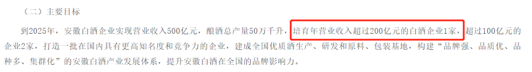今年3月份安徽省出了一个《促进安徽白酒产业高质量发展的若干意见》,里面有两点我觉得比较有意思,一点是主要目标,显然,这家企业只能是古井了,而古井自己给的计划是2024年营收过200亿,今年预计是106亿左右,相当于4、5年翻一倍。能不能实现不好说,但至少安徽政府和古井自己都给了这样一个业绩指引。