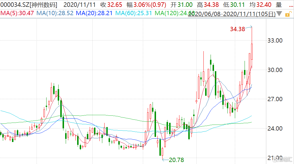 格隆汇11月11日丨因公告与华为未就荣耀出售一事达成任何协议,昨日尾盘直线拉升封涨停板的神州数码(000034.SZ)今早一度低开2.15%,但开盘后再度直线拉升,盘中一度冲高涨8.52%至34.38元,股价创历史新高,市值一度达224亿元。昨日有消息称华为计划以1000亿元的价格将荣耀手机业务整体打包出售,提及神州数码、TCL等会参与收购。神州数码回应称,截至2020年11月11日,神州数码与华为未就荣耀出售一事达成任何协议。不过,据格隆汇从知情人事处了解到,华为荣耀出售一事确实是事实,只等官宣。而目前市场传闻最多的接盘方包括TCL、神州数码等产业链企业组成的小股东阵营;另外,由渠道商组成的合伙企业”深圳星盟”也被认为是最有可能的收购方。