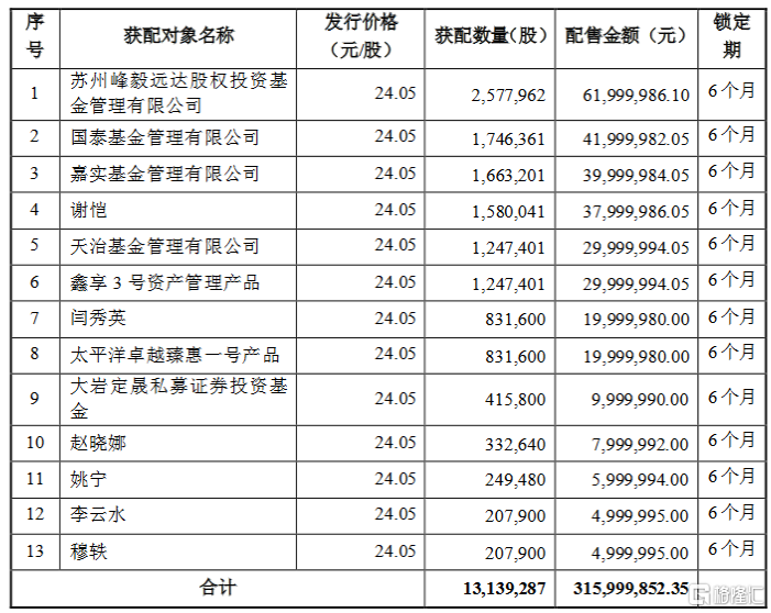 格隆汇 11 月 11日丨科蓝软件(300663.SZ)披露非公开发行股票新增股份变动报告及上市公告书,发行人和联席主承销商根据本次发行的股份配售规则以及有效认购的簿记建档情况,对有效认购对象进行配售。此次发行最终获配投资者共13家,发行价格为24.05元/股,此次发行股票数量为1313.9287万股,募集资金总额约3.16亿元。各发行对象获得配售的情况如下: