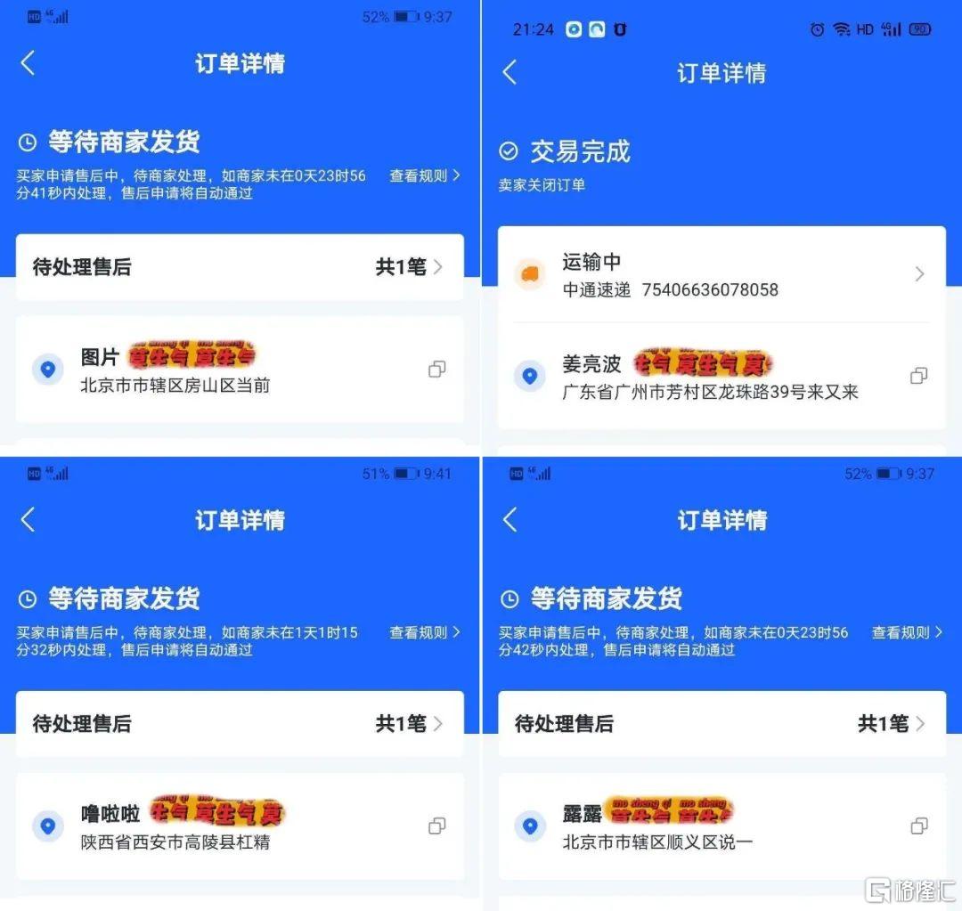 而同一场直播的其他品牌,退货率更是高到不可想象的99.99%,甚至部分商家所有订单被发起了退款申请,一单都没有发出去。商家们核对后台才发现,订单地址“都是瞎编乱造”,买家名字也很奇怪,比如“图片”。