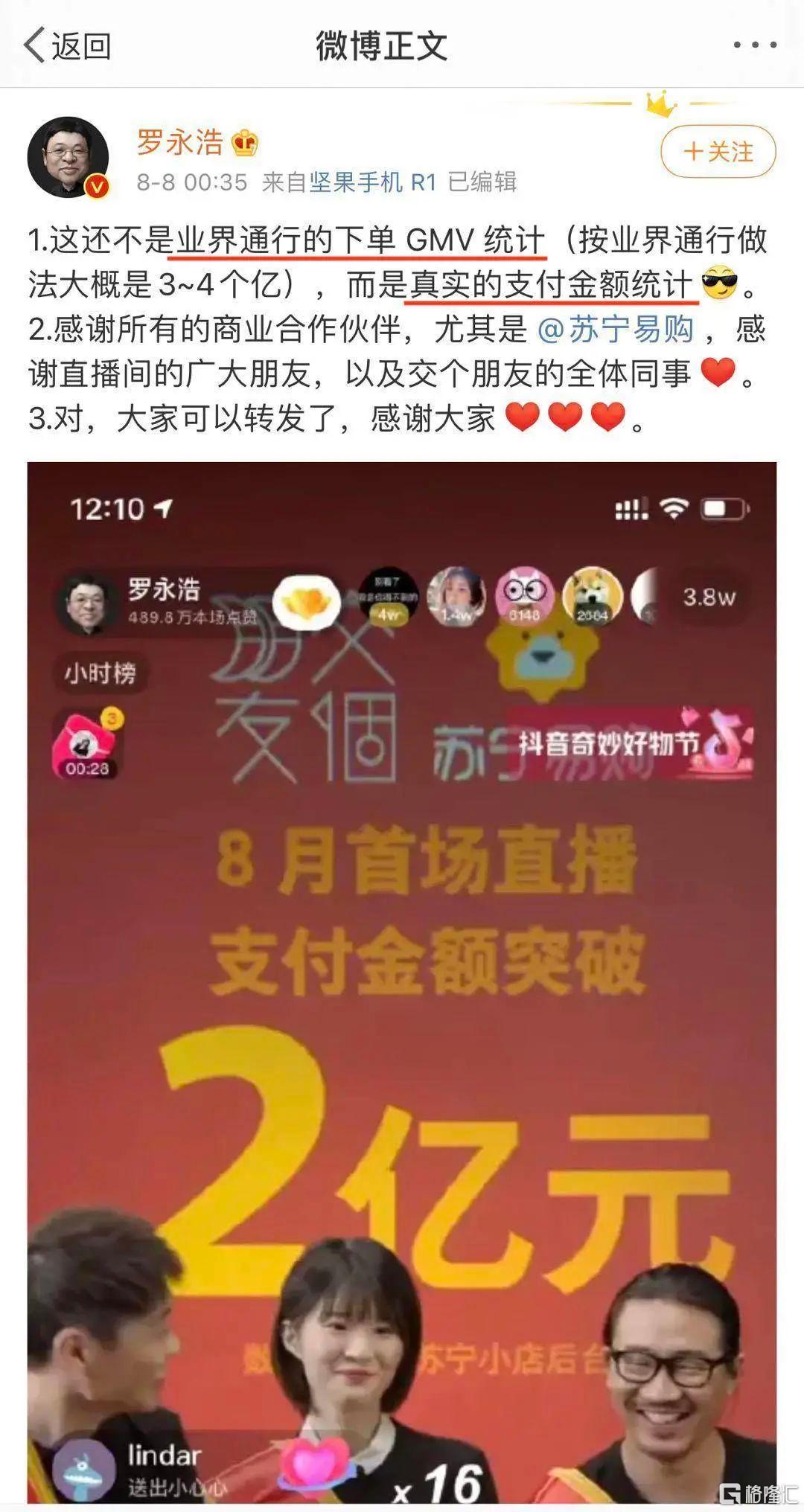 按照罗永浩的说法,他直播间的官方战报是按照真实的支付金额计算GMV。以他8月第一场直播的数据来看,下单GMV3-4亿元,支付GMV2亿元,以零退货率来算,刨除掉“未付款”这一项,就挤出了30%-50%的水分