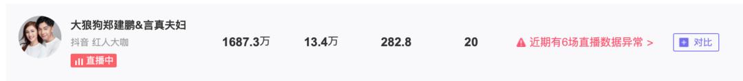 截至11月11日19:12,小葫芦大数据显示,数据存在异常的主播,包括大狼狗郑建鹏&言真夫妇,依据是有商品可能被直播间观众批量购买
