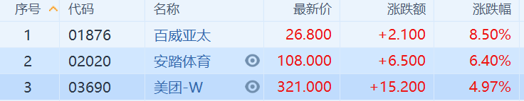 美团高开约5%,百威亚太高开8.5%,安踏体育高开6.4%。
