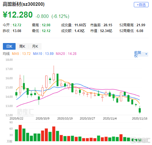 格隆汇11月16日丨高盟新材(300200.SZ)逆势跌6.12%,报12.28元创9月中旬以来新低,暂成交1.43亿元,最新总市值52.34亿。公司13日公告称,持股5.29%的股东高盟投资拟15个交易日之后的6个月内通过集中竞价方式减持不超852万股,不超过公司总股本的1.9989%。