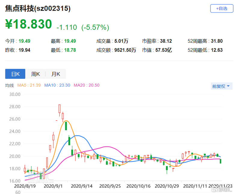 格隆汇11月23日丨焦点科技(002315.SZ)跌5.57%,报18.83元,总市值57.5亿元。焦点科技11月20日公布,公司控股股东沈锦华持有公司股份155,715,158股(占公司总股本比例50.97%),其计划自公告披露之日起十五个交易日后的九十个自然日内,以集中竞价方式减持公司股份不超过305.5万股,占公司总股本比例不超过1%。