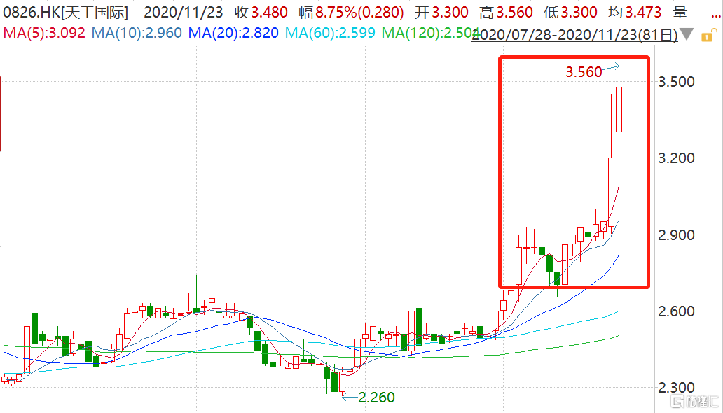 格隆汇11月23日丨继上周五收涨8.47%创上市新高后,天工国际(0826.HK)今日盘中再度大涨11.25%至3.56港元,续创历史新高价,市值超90亿港元。格隆汇平台曾于11月3日推出深度文章《天工国际:新材料龙头的投资逻辑是什么?》指出,天工国际作为中国高端新材料制造商头部,当前仍处于被低估的区间,估值走势与股价走势稍显背离,加之业绩增长前景乐观,其中可能蕴含投资机会......详情可点击下列链接详细了解。自格隆汇平台深度文章推出至今,该股从2.68港元上涨至今(3.56港元),累涨32.84%。