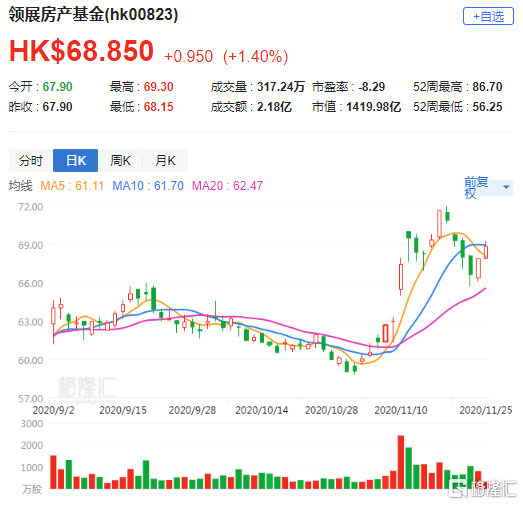 匯豐維持領展買入評級,目標價82.2港元,領展2020年9月底每股賬面值74.6港元,現價相等於2021財年預測股息率4.4%。