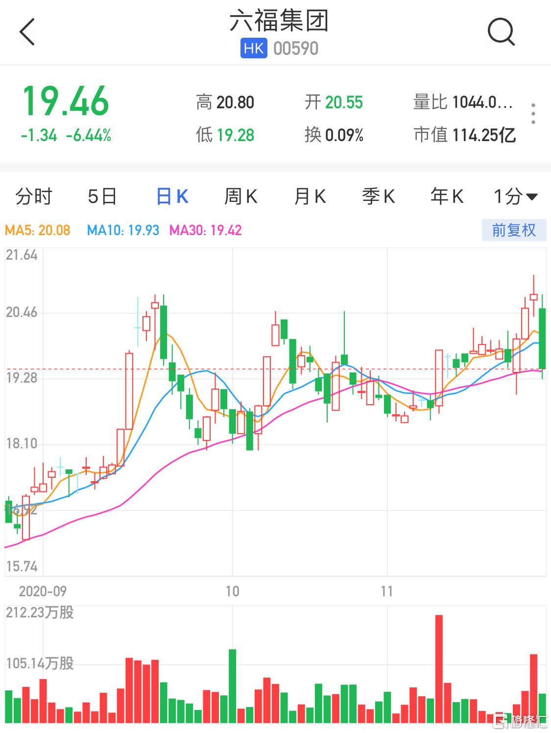 格隆汇11月26日丨六福集团(0590.HK)跌幅扩大至6.44%,昨日曾创逾9个月新高价。现报19.46港元,暂成交1044万港元,总市值114.2亿港元。公司将于今日盘后发布中期业绩,以及考虑派发中期股息(如有)。日前公司发盈警,预期截至9月30日止中期收入及净溢利按年跌约50%和40%。集团于2020年7月至9月季度的收入及净溢利仍然录得跌幅。