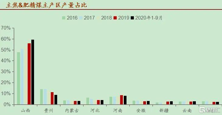 我国主焦和肥煤的主产区集中在山西、贵州两地,其中贵州最近几年产量持续下滑,山西自然而然成了过去几年国内供给增加的主要动力,占比由2016年的48%一路增至2020年9月的59%。当前煤炭供改步入尾声,其他地区产能释放始终受限,因此,山西的在未来主焦和肥煤供给端的重要性愈发突出。