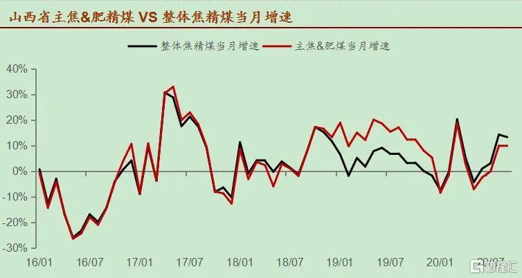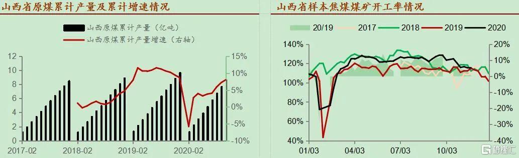 从国家能源局公布的生产产能角度来看,山西地区煤炭生产能力为9.63亿吨/年,截至2019年,其原煤产量为9.71亿吨,产能利用率达100.83%,存在一定超产情况。而进入2020年以来,山西地区原煤产量增速持续攀升,1—10月的累计增速达8%。即2020年内,山西地区煤矿超产情况更加严重,这也可从更微观的开工率数据找到佐证,自3月份以来,山西省样本焦煤煤矿开工率同比维持10%左右的增长水平。