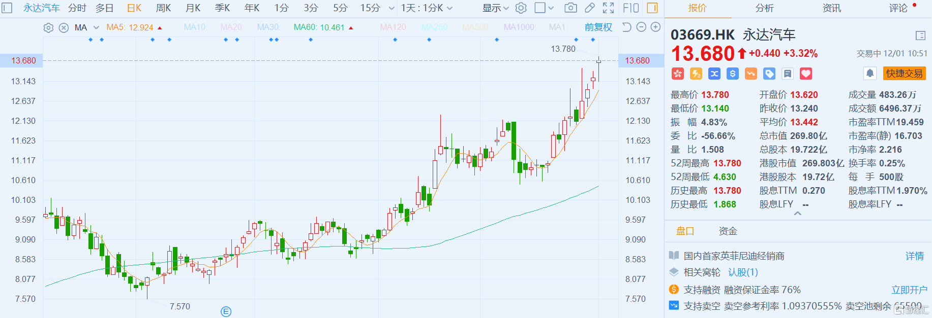 港股异动丨永达汽车(3669.HK)创历史新高 拟收购六家宝马4S店资产及业务