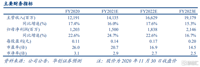发展战略清晰可持续,长期看好逻辑不改。公司持续聚焦羽绒服主业,定位“全球热销羽绒服专家”,未来短期内公司将通过供应链和渠道优化巩固战果,长期有望通过品牌持续升级进一步提升市场份额。考虑到冷冬、春节晚等外部利好因素,以及公司在羽绒服行业品牌、渠道和管理上的竞争优势,我们略上调公司盈利预测,将 2021-2023 财年归母净利润预测由 14.1/17.4/21.0 上调为 15.0/18.4/21.5 亿元,EPS 分别为 0.14/0.17/0.20 元,对应当前股价 PE 分别为21/17/15 倍,维持 4.25 港币/股目标价,对应 2021 财年估值 26 倍,维持“强推”评级。