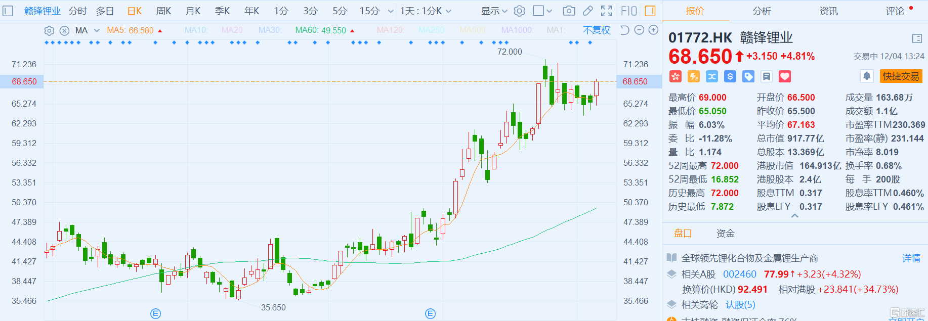 港股异动丨赣锋锂业(1772.HK)涨近5% 机构称明年电池级碳酸锂价格有望上涨至6万/吨
