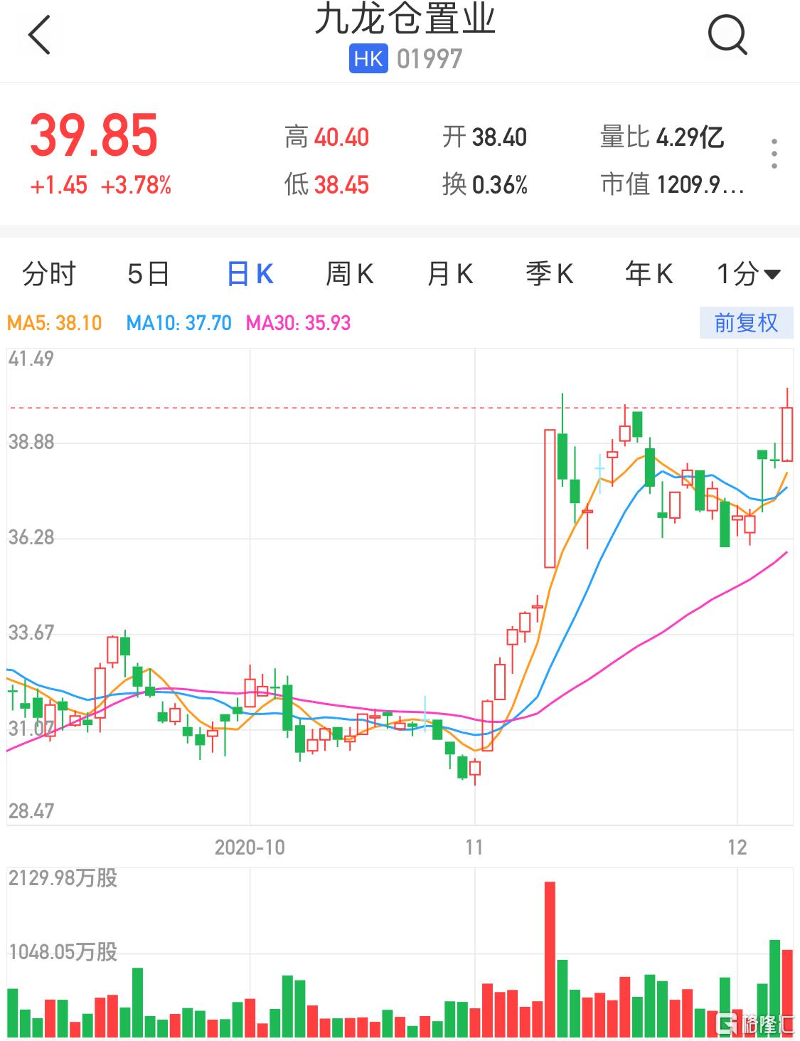 港股异动 | 九龙仓置业(1997.HK)升近4%领涨蓝筹 股价逾9个月新高