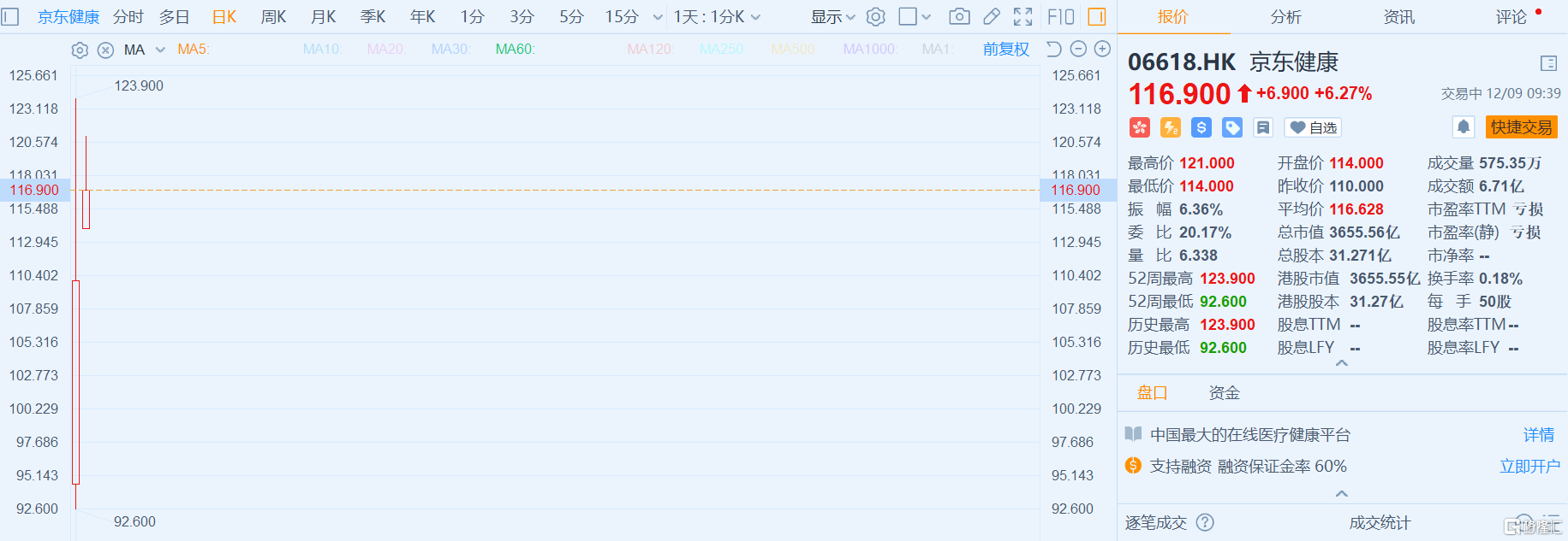 格隆汇12月9日丨京东健康(6618.HK)上市翌日续涨逾6%,报116.9港元,总市值达3655亿港元。京东健康(6618.HK)昨天首日上市收涨55.85%报110港元,成交160.39亿港元,全天换手率5%。该股盘中一度涨75.55%至123.9港元,市值一度达3874亿港元。多家指数公司宣布快速纳入京东健康在旗下指数系列内。MSCI宣布,将京东健康纳入MSCI标准指数及大盘股指数,于12月22日起生效。富时罗素则公布,会在富时香港指数纳入京东健康,在12月21日起生效。恒指公司目前未公布纳入京东健康在旗下指数内,但恒指公司年内在新推出的恒生科技指数、恒生国指设立快速纳入机制,京东健康有望在上市第10个交易日收市后(即12月22日)纳入恒生科技指数内。