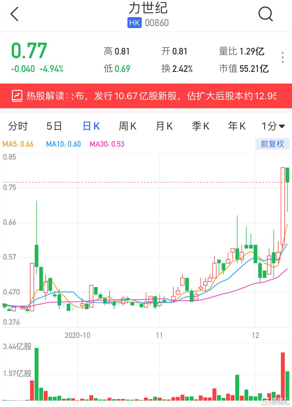 格隆汇12月10日丨昨日大幅上涨的力世纪(0860.HK)今日明显回落,盘中一度跌超13%,现报0.77港元,跌幅收窄至4.94%,暂成交1.29亿港元,总市值55.2亿港元。昨日尾盘股价涨幅急剧扩大,大幅收涨近40%,股价创逾2年新高价。力世纪日前公告,折让19.3%配售10.66亿股新股,净筹4.86亿港元。另外,公司将于12月30日举行董事会议以审批年度业绩及派发末期股息(如有),此前公司中期亏损大幅扩大至2.03亿港元。