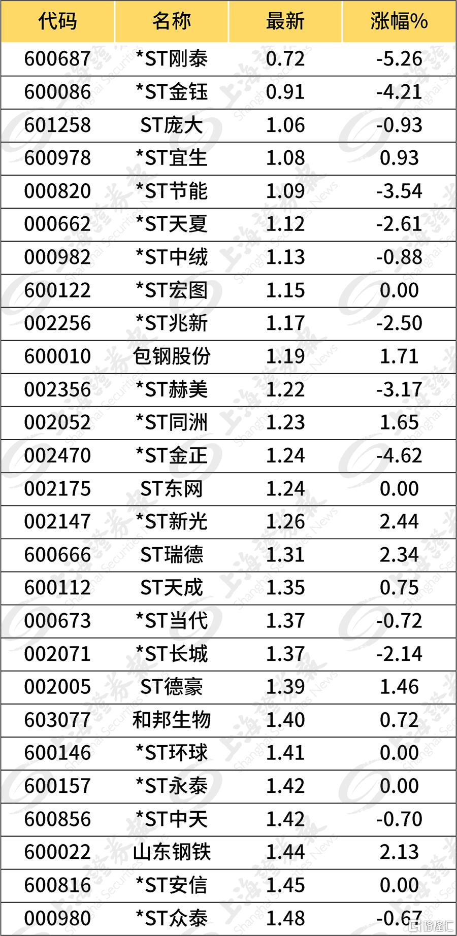 截至今日收盘,根据东方财富Choice数据统计,尚有27只个股收盘价不足1.5元(剔除已进入退市整理期的个股),其中ST和*ST个股数量占比高达88.9%。