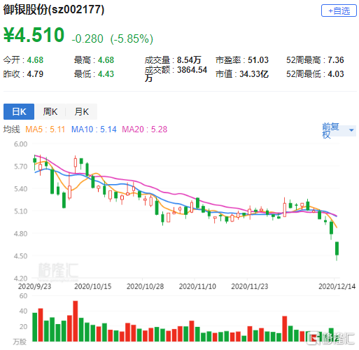 格隆汇12月14日丨御银股份(002177.SZ)延续近期弱势,盘中最低见4.43元创五个月新低,最大跌幅7%,现报4.51元,跌幅5.85%,最新总市值34.33亿,近六个交易日累计跌逾10%。公司11日公告称,实际控制人杨文江计划在公告披露之日起十五个交易日后六个月内以集中竞价方式减持公司股份不超过1522.3825万股,占公司总股本比例不超过2%。