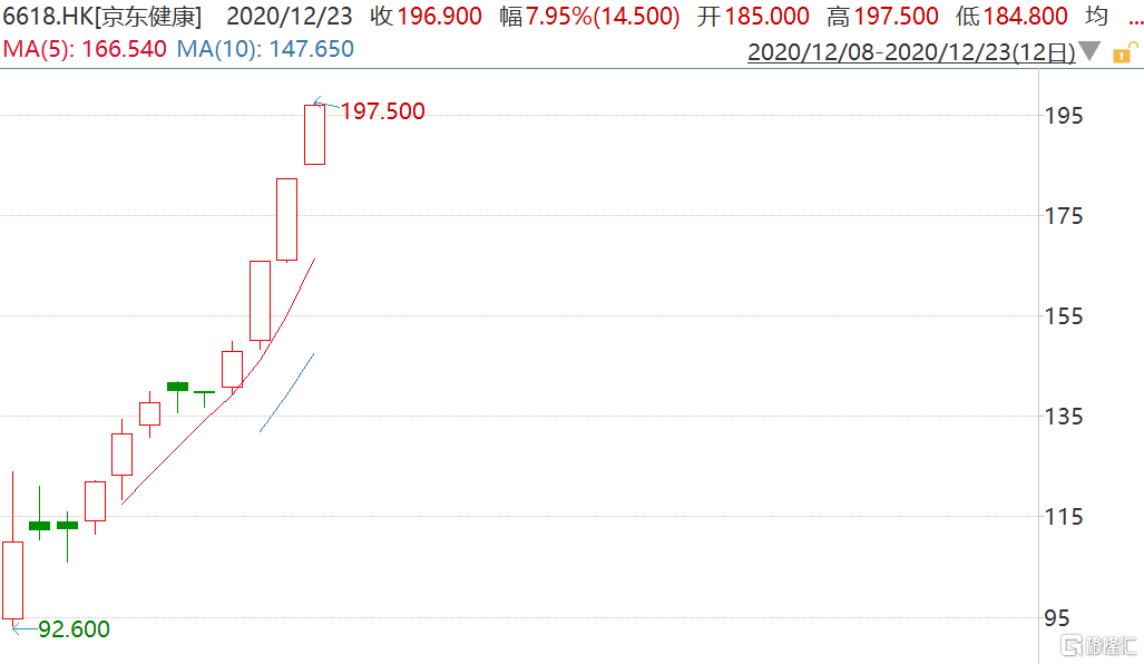 格隆汇12月23日丨次新股京东健康(6618.HK)继续上涨,盘中一度涨8.28%至197.5港元,半日收涨7.95%报196.9港元,较IPO价格70.58港元涨179%,最新市值6157亿港元。京东健康已获纳入中国互联网指数、恒生综合指数、恒生中国企业指数、恒生科技指数、恒生医疗保健指数、恒生港股通新经济指数等众多指数,也被深交所调入深港通下的港股通股票名单,昨日起生效。据格隆汇APP显示,昨日港股通资金净买入京东健康2.41亿港元。