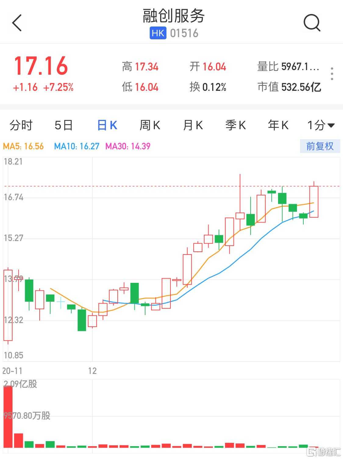 格隆汇12月31日丨融创服务(1516.HK)快速拉升至7.25%,报17.16港元逼近历史高位,暂成交5967万港元,总市值532.56亿港元。汇丰发布研报称,融创服务盈利增长率高、扩张迅速,在母公司支持下拥有强大的并购及获取第三方项目的能力,予其“买入”评级,目标价22.3港元,并将公司列为“首选”。日前大摩、花旗首予融创服务“增持/买入”。花旗认为由于潜在的盈利和明年2月可能纳入恒指沪港通 ,预测至2022年融创服务管理的建筑面积将增长至3.55亿平方米。