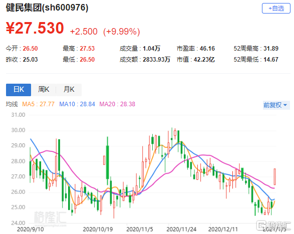 格隆汇1月5日丨健民集团(600976.SH)盘初直线涨停,报27.53元收复近期跌势,总市值42.23亿元。健民集团4日公告,股份回购价由不超24元/股上调至不超35元/股。在2020年12月,公司股价一直高于拟回购价格上限,未有回购发生。截至2020年12月31日,公司通过集中竞价交易方式累计回购股份8万股。