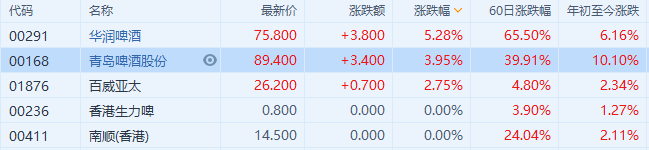 港股异动 | 啤酒股普涨 润啤(0291.HK)、青啤(0168.HK)齐创历史新高