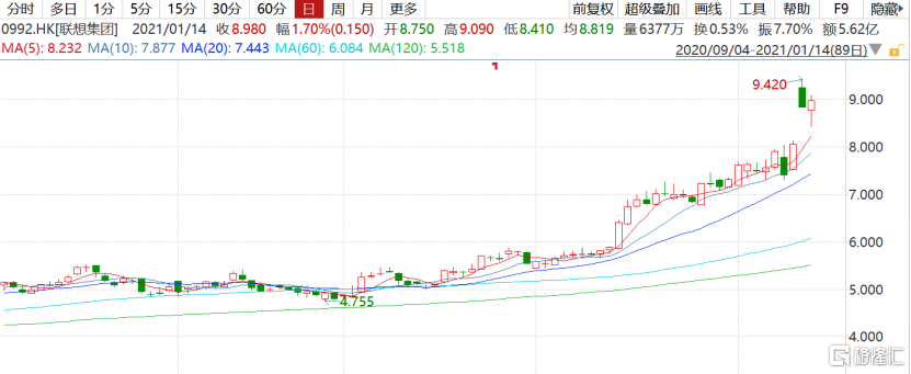 投行对联想集团的关注度正在快速上升,交银国际、麦格里、瑞信、建银国际等纷纷看高联想集团。交银国际最新发布的研报将联想集团的目标价由7港元提升至9.2港元,维持“买入”评级。交银国际认为,联想集团2020年第四季度最大的亮点是市场份额上升,预计联想集团21财年第三季度的税前利润将达到4.64亿美元(同比增长19%),收入161亿美元,电脑业务税前利润率6.2%;并预计联想21财年4季度个人电脑出货量将保持强劲。