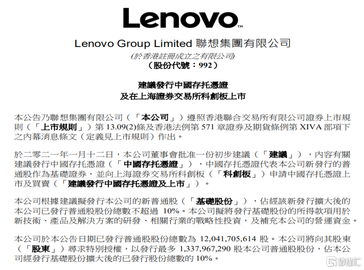 1月12日晚间,联想集团发布公告称,公司已向香港联合交易所有限公司提交公告,宣布董事会已批准可能发行中国存托凭证(CDR)、并向上海证券交易所科创板申请CDR上市及买卖的初步建议。