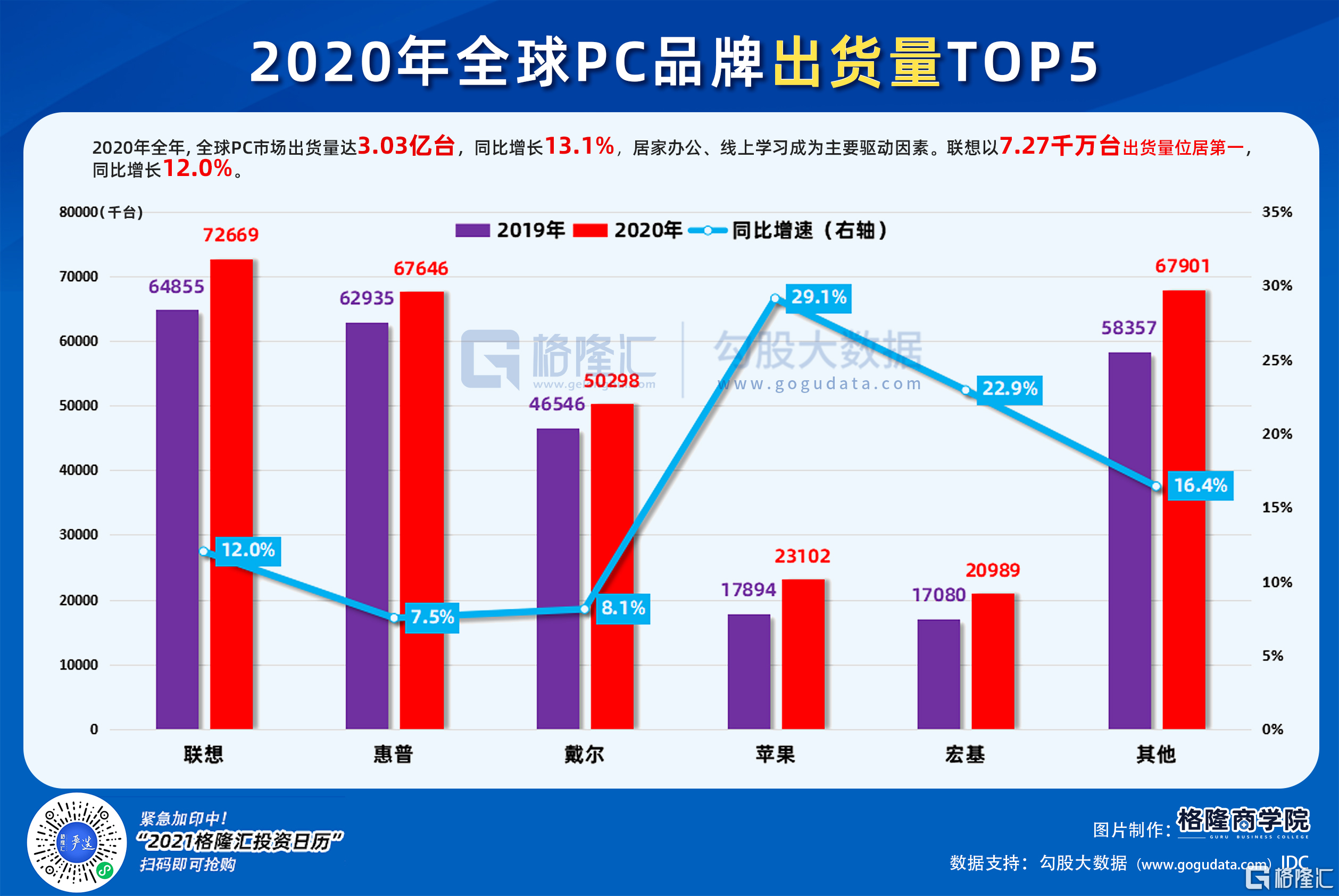 根据IDC数据,2020年全年,全球PC市场出货量达3.03亿台,同比增长13.1%,居家办公、线上学习成为主要驱动因素。2020年的PC出货量增速为十年来的最高水平,上一次如此高增长率的是2010年,该年的增长率为13.7%。