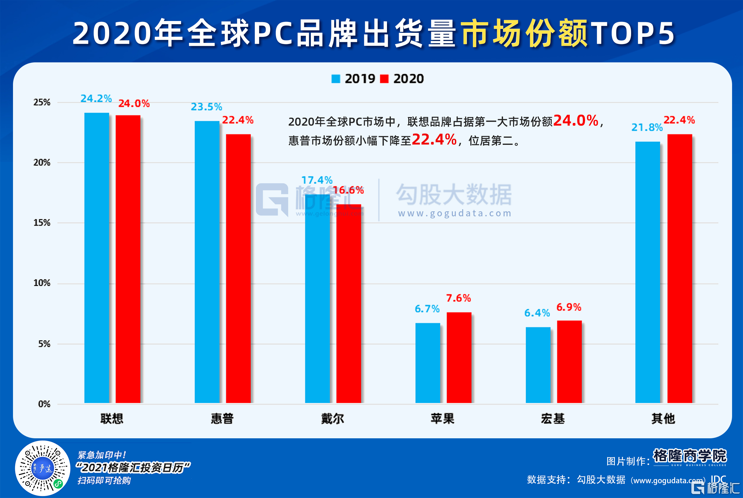 2020年全年,PC市场全球排名前五的电脑厂商中,联想以7266.9万台出货量位居第一,同比增长12%,市场份额达到24%。另外,惠普、戴尔、苹果、宏碁的市场份额分别为22.4%、16.6%、7.6%和6.9%。联想不仅市场份额领先,其高达12%的出货量增速也高于第二名惠普的7.5%和第三名戴尔的8.1%。