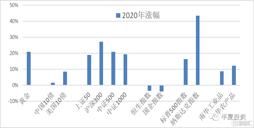 2020年因为全球大放水,低利率,强财政刺激,全球几乎所有的资产类别都实现了上涨,无论中美股票,中美债券,黄金,数字货币,还是大宗商品。