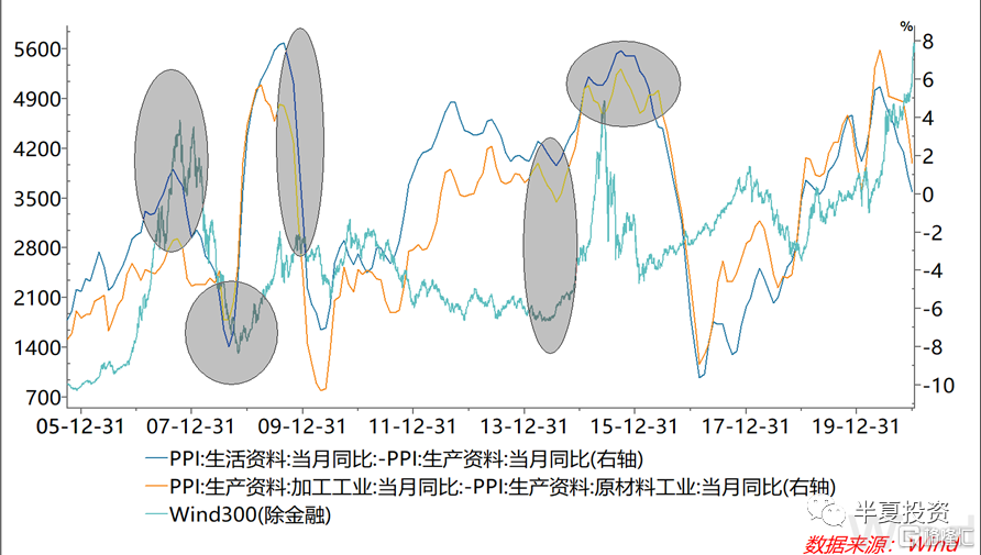 A股按市场权重,大部分上市公司分布在中游和下游,所以,中游和下游企业的盈利能力趋势,分别可以用 生产资料与原材料的价格走势差, 生活资料与生产资料 的价格走势差 来度量。