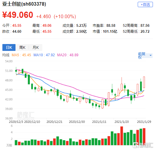 格隆汇1月29日丨亚士创能(603378.SH)继续涨停,录得三日两板,报49.06元创一个月新高,最新总市值101.15亿。公司26日公告称,预计2020年度净利升182.72%至3.23亿元,主要由于主营产品销售收入同比增长,且综合毛利率提升所致。东北证券指,根据业绩快报计算得出公司单四季度归母净利润0.86亿元,同比增长153%。首次覆盖,给予公司“增持”评级,预计公司2020-2022年归母净利润增速为183%/41%/39%,EPS为1.57/2.21/3.07元。