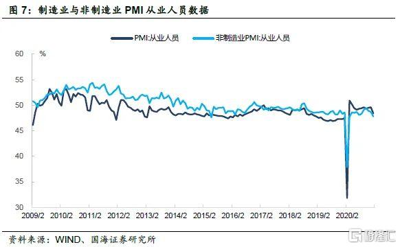 就业压力有所升温。1月制造业从业人员项为48.4%,较上月回落1.2个百分点。非制造业从业人员项为47.8%,较上月回落0.9个百分点。冬季停工带动就业数据出现季节性回落,此外,疫情影响和春节返乡政策或导致工人提前返乡,叠加供需两端扩张放缓,进一步带动就业数据的回落。下一阶段,在“不急转弯”的主基调下,就业数据的边际变化,还需关注经济复苏幅度以及稳就业政策的落地情况。