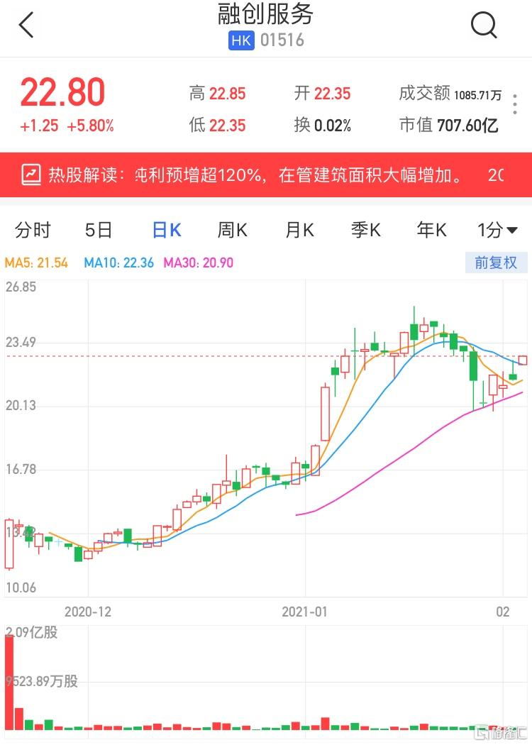 格隆汇2月3日丨融创服务(1516.HK)高开高走,现报22.8港元,涨5.8%,暂成交1085万港元,最新总市值707亿港元。融创服务今日早间发公告称,预期截至2020年12月31日止年度公司拥有人应占溢利较上年度增长超过120%,主要由于本年度的在管建筑面积大幅增加及社区增值服务的发展带来收入的大幅增加,以及积极采取降本增效的举措带来的盈利水平的提升。