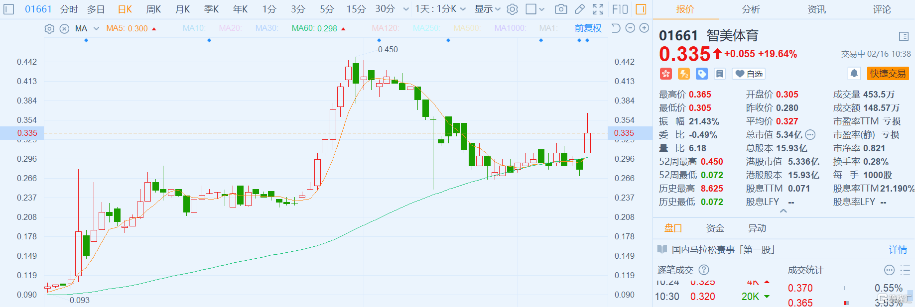 港股异动丨智美体育(1661.HK)涨19.64% 上调配售价
