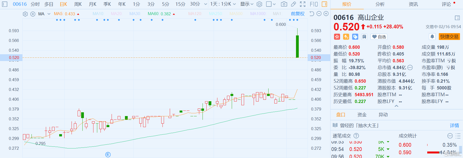 格隆汇2月16日丨高山企业(0616.HK)涨28.4%,报0.52港元,高见0.6港元创约一年来新高,总市值5亿港元。高山企业(0616.HK)、永义国际(1218.HK)公告,于2021年2月3日,要约人运荣投资有限公司(永义国际全资附属公司)已告知高山董事会,拟待先决条件获达成后,作出自愿有条件现金要约以股份要约价收购全部已发行高山股份。每股高山股份要约价现金0.50港元,较2月3日收市价每股高山股份0.405港元溢价约23.5%。永义国际(1218.HK)则涨13.77%。