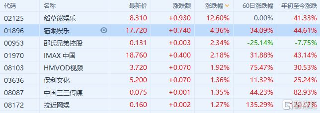 格隆汇2月17日丨影视股延续昨日强势,猫眼娱乐(1896.HK)涨超4%,IMAX中国涨超2%。据灯塔实时数据,昨晚20时56分,2021春节档期内(2月11-17日)总票房(含预售)破70亿元。《唐人街探案3》以33.6亿暂列春节档总票房第一,《你好,李焕英》超22亿排在第二,第三名《刺杀小说家》近5亿。摩通发研报指,预期内地今年春节票房创新高,票房收入的强劲增长反映了疫情对内地电影市场限制的影响轻微并加强该行观点,内容质量已成为中国票房的主要推动力。该行料电影相关股股价表现会受惠于内地票房增长势头,当中阿里影业、猫眼娱乐、IMAX中国等为行业主要受惠者。