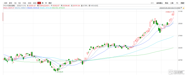 2021年牛年香港股市就迎来了开门红,今天的行情依然如火如荼,不知不觉恒生指数已经来到了31000点。美国是全球流动性的源头,持续的货币宽松势必会造成资产荒;A股行情受货币政策,市场流动性影响较大;而港股和经济走势呈现正相关性。也可以这么说,港股牛市正在路上。