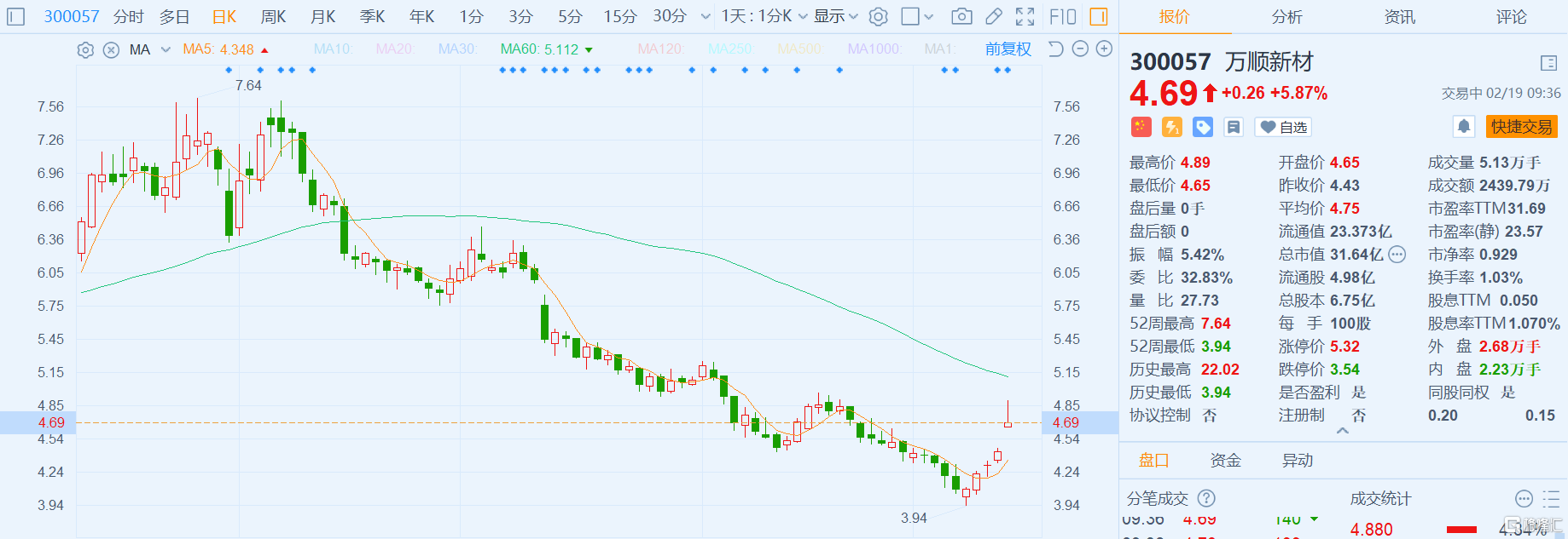 格隆汇2月19日丨万顺新材(300057.SZ)高开,现涨近6%,报4.69元,最新总市值23亿元。万顺新材昨日公布,公司拟以1亿元-2亿元回购公司部分社会公众股份,用于实施员工持股计划、股权激励或转换上市公司发行的可转换为股票的公司债券;回购价不超人民币6.9元/股(含);回购期限自公司董事会审议通过本次回购股份方案之日起不超过12个月。