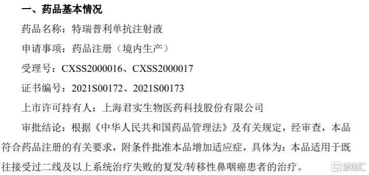 君实生物(01877.HK):特瑞普利单抗用于治疗既往接受过二线及以上系统治疗失败的复发/转移性鼻咽癌患者的新适应症上市申请获得批准