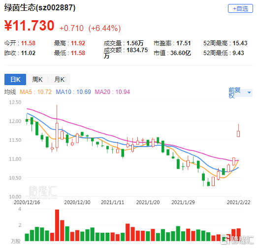 格隆汇2月22日丨绿茵生态(002887.SZ)冲高涨逾8%后回落,现报11.73元,涨幅6.4%,最新总市值36.6亿。公司21日公告称,拟以0.8亿元-1.6亿元回购公司股份,用于转换公司发行的可转换为股票的公司债券,回购股份的价格区间不超过人民币16.66元/股。