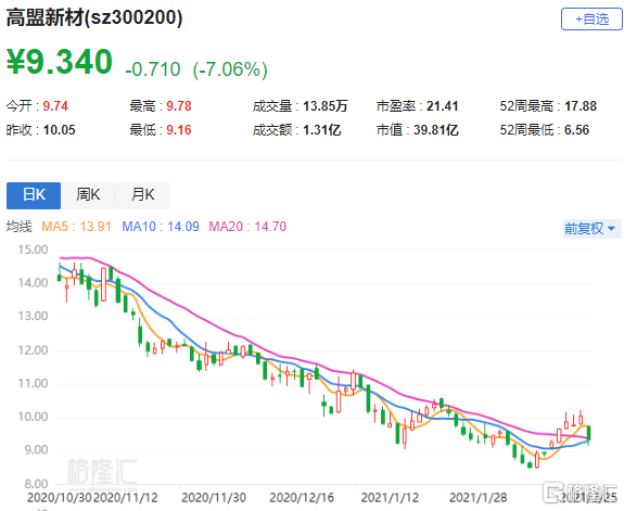 A股异动 | 高盟新材(300200.SZ)跌7% 三名股东拟合计减持不超2%公司股份