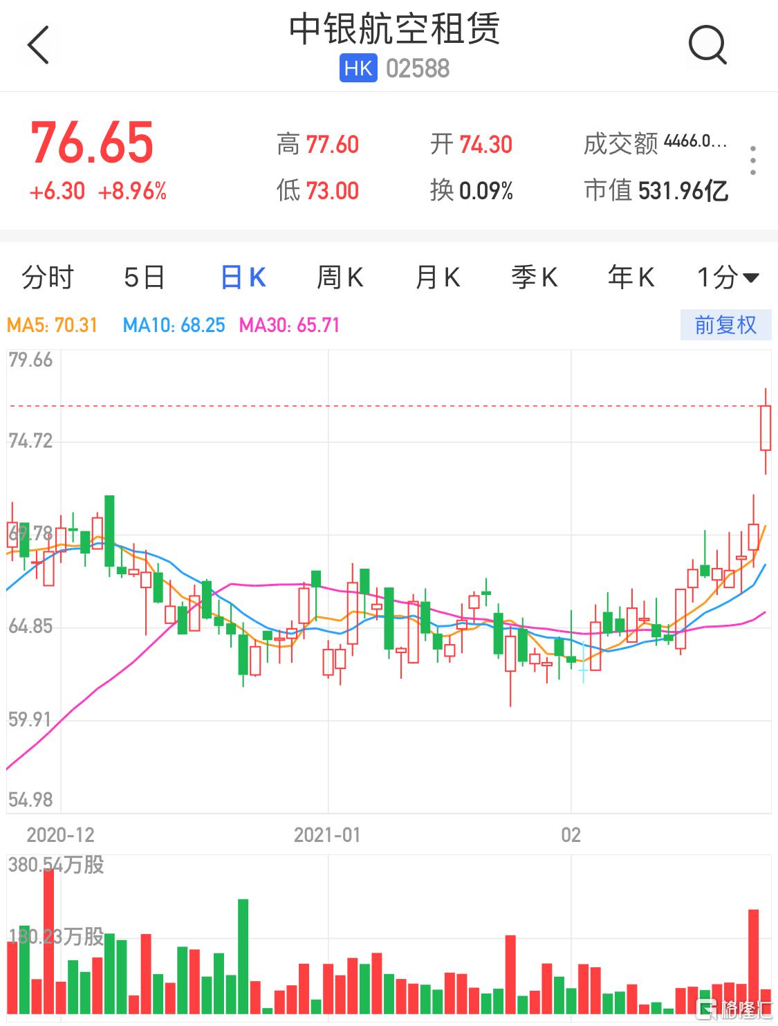 格隆汇2月25日丨中银航空租赁(2588.HK)高开高走,现涨8.96%,报76.65港元逼近历史高价,总市值532亿港元。中银航空租赁日前获FIL Limited增持6.8万股,涉资约463.50万港元。瑞银曾引述管理层指,公司对比同业具优势,同时备有保守的投资策略,降公司去年盈利以反映高拨备和投资亏损,但预期今年可回复至2019年水平,对其长远发展维持乐观看法。