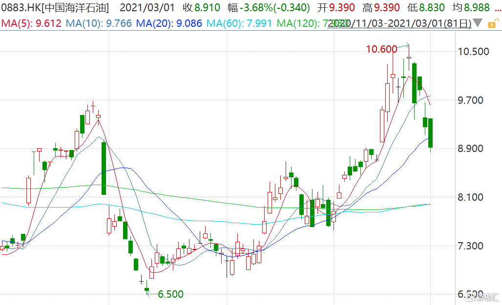 格隆汇3月1日丨中海油(0883.HK)盘中一度跌4.54%报8.83港元,股价创2月10日以来新低,市值3978亿港元。纽约证交所将于2021年3月9日上午四时整(东部标准时间)暂停中海油美国存托股份的买卖。中海油表示,纽交所26日决定对公司美国存托股份启动下市程序。公司以美国存托股份形式持有的普通股占公司总已发行股本约0.5%,该决定和行动可能影响公司证券的交易价格和数量。