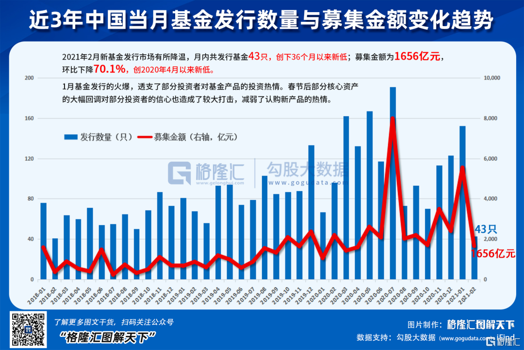 追涨杀跌,是市场永恒不变的人性。市场暴跌,明显影响到了新基金的发行。据统计2月新发基金一共只有43只,创下36个月以来新低,募资1656亿元,环比大幅下滑70%,创下2020年3月以来新低。