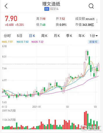 格隆汇3月3日丨理文造纸(2314.HK)股价继续回升,现报7.9港元,涨幅5.3%,最新总市值343.4亿港元。公司昨日公布,截至2020年12月31日止年度,集团实现收入258.68亿港元,同比下降4.7%;毛利57.48亿港元,同比增长12.9%;公司拥有人应占纯利35.24亿港元,同比增长8.9%。花旗指,公司去年利润超过该行预期,考虑到中国消费复苏和公司低估值水平,重申对公司的买入评级,调升目标价35%至8.4港元。瑞信指,公司去年盈利优于市场及预期,上调集团今明两年盈利预测分别8.6%及8.3%,目标价由9.3港元升至9.5港元,评级维持跑赢大市。