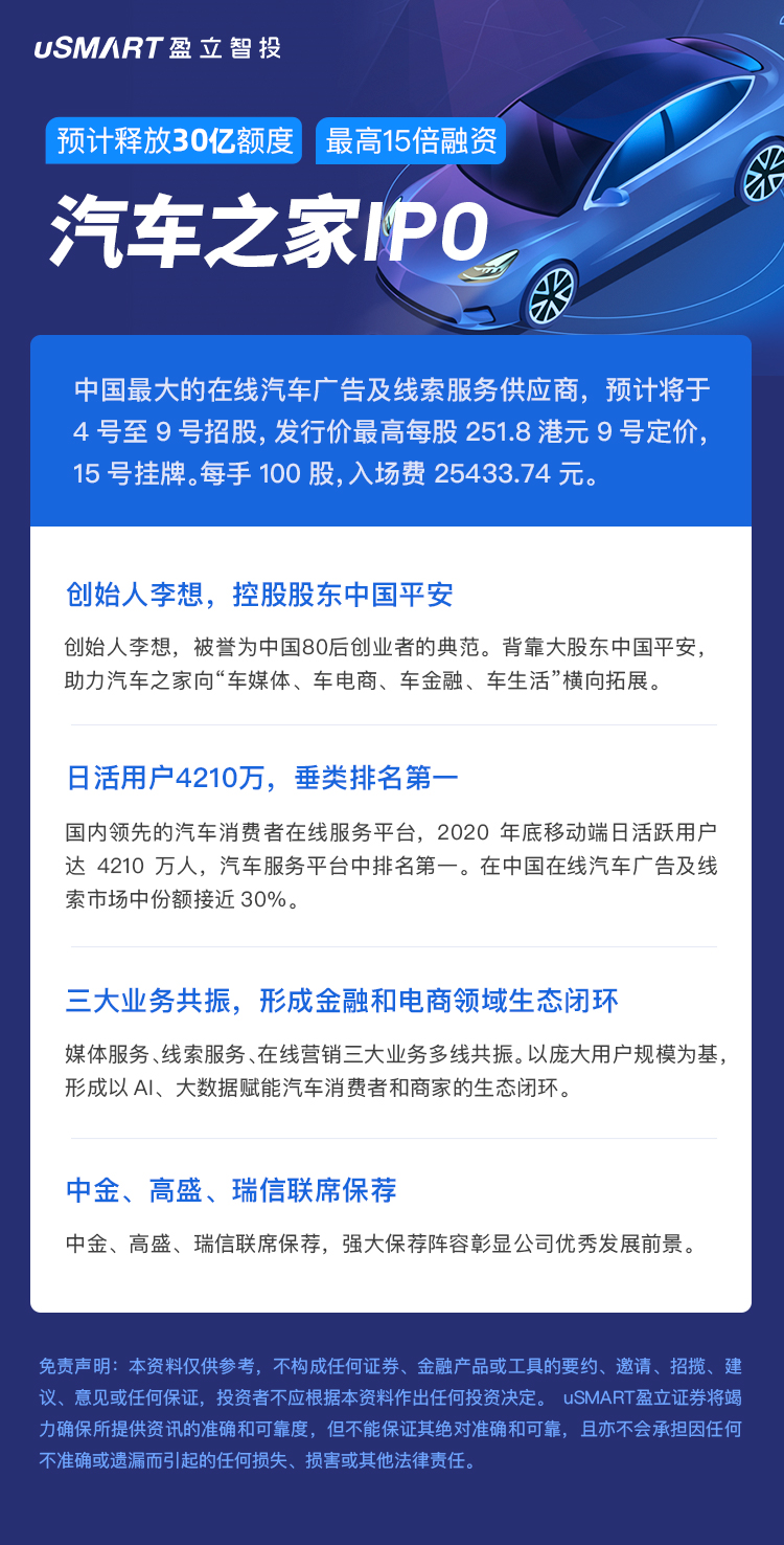 uSMART盈立智投3月3日消息,中国最大的在线汽车广告及线索服务供应商,汽车之家预期将于本月4日,即明日起至本月9日公开招股,9日定价,15日挂牌。