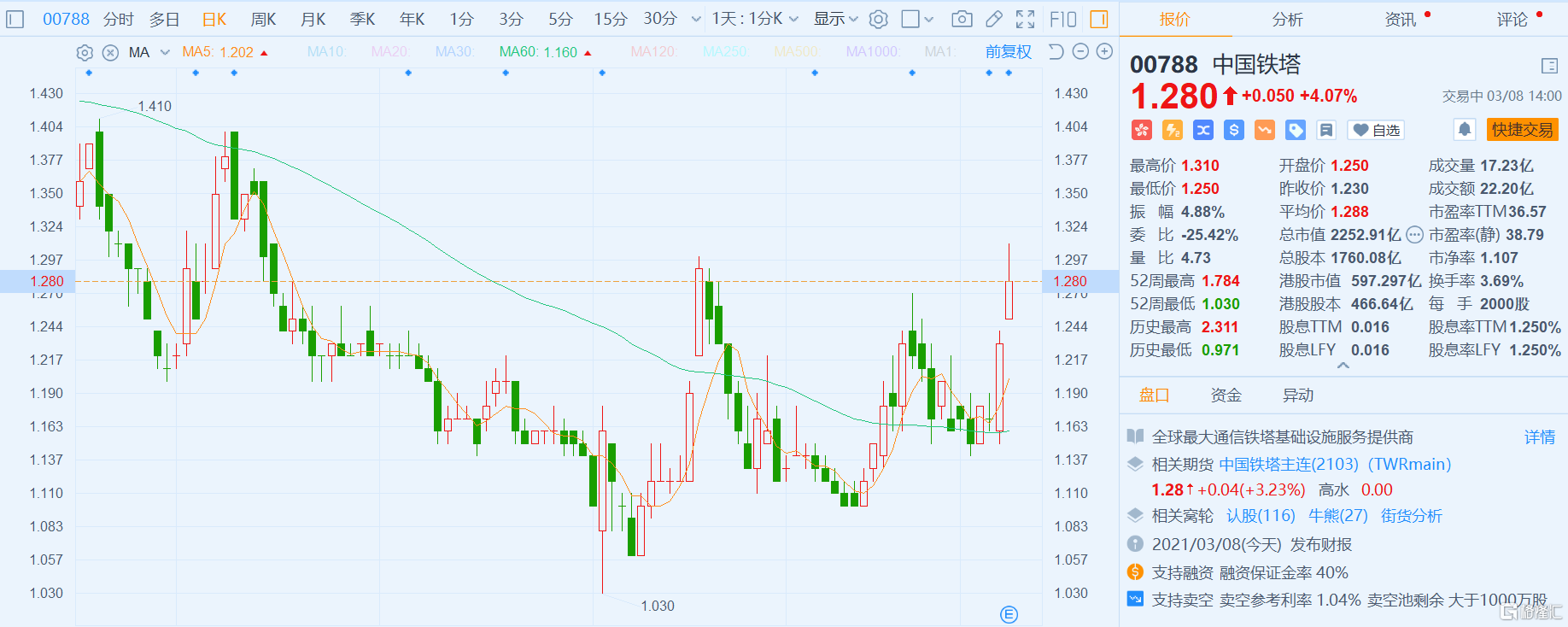 港股异动丨中国铁塔(0788.HK)涨逾4% 年度纯利升23.1%至64.28亿元