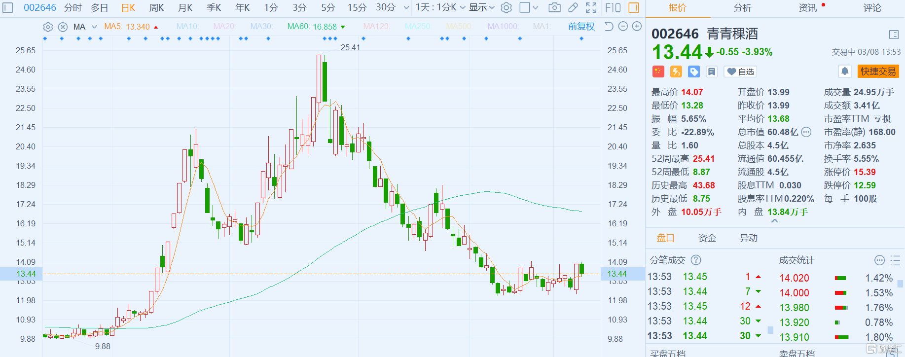 格隆汇3月8日丨青青稞酒(002646.SZ)跌约4%,报13.44元,自去年12月23日见阶段高点25.41元以来,股价已经累跌逾47%,最新总市值60.5亿元。